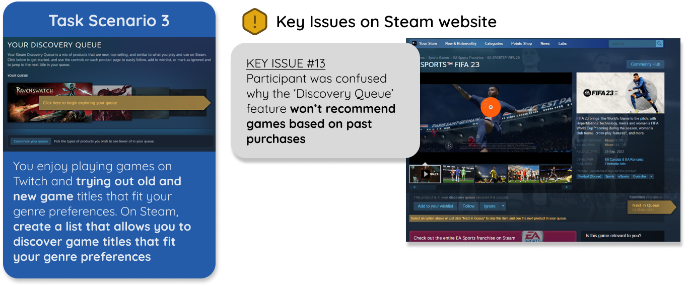 I conducted a System Usability Scale with the participants after they did the 3 Task scenarios. Based on the diagram below, we can deduce that there are areas on the Steam website that can be improved further.